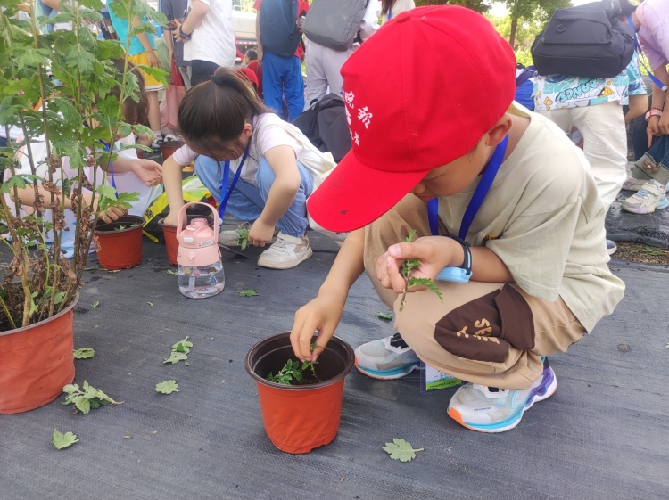 孩子们在科普志愿者的带领下,有序进入扦插区,按照老师的讲解,挑选枝条、剪下插穗、去除多余叶片、浸泡插穗、沙土装盆、扦插插穗……他们用极大的热情与专注完成了各自的扦插作品,并将这份蕴含真挚情感的独特礼物送给了母亲们,让这个母亲节充满了温暖与爱意。活动最后,市园林科研所科普志愿者们还为孩子们赠送菊苗300余盆。
