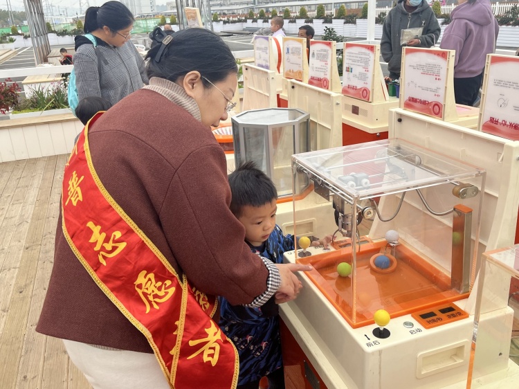 官堰湖木屋风情街位于荆门高新区锂电片区内,是园区企业员工玩乐休闲的聚集地。得知开展科普活动的消息,一大早便陆陆续续有家长带着孩子来参加。有趣的科普大篷车展品总是能第一时间吸引孩子们的目光,“合作运球”“垃圾分类”“短期记忆测试”等科普展品,将科学原理通过直观的方式呈现出来。孩子们在和家长动手操作展品的同时,能够对科学产生浓厚的兴趣,并主动了解相关的声、光、电、磁、力等科学知识。