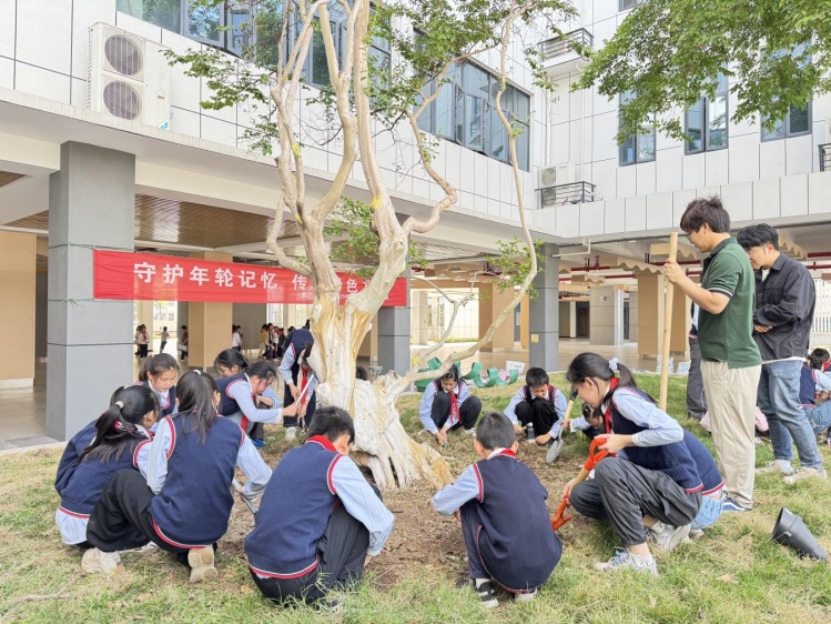 在实操环节,志愿者通过“理论+示范+互动”模式,指导学生为校园内两株紫薇古树开展养护。150名学生分成10个实践小组,有序完成树冠投影区杂草清除、草石分隔带安装、腐熟树皮铺设等养护工作。同学们在亲手触摸古树树皮、观察根系生长状态的过程中,深刻体会到 "敬畏自然、尊重生命" 的生态内涵。