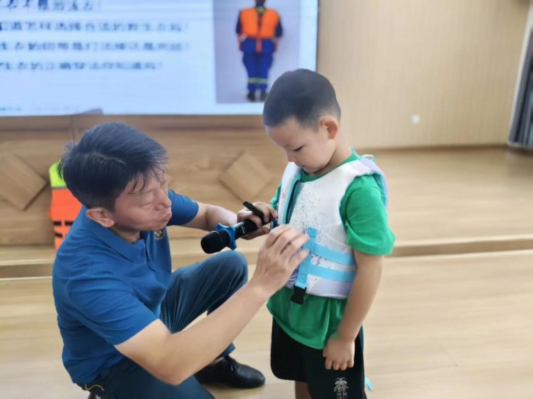 课堂上,来自荆门市蓝天应急救援中心的讲师围绕“溺水高发场景”“自救与他救常见误区”等核心内容展开理论讲解,用生动形象的语言解读防溺水“六不准”关键要点,帮助孩子们清晰认知远离危险水域的重要性。结合模拟场景进行实操演示,手把手指导孩子们正确使用救生圈、漂浮物等救援工具,示范溺水时的规范呼救姿势与自救动作。